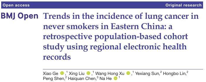 [4] Ge X, Liu X, Xu WH, et al. Trends in the incidence of lung cancer in never smokers in Eastern China: a retrospective population- based cohort study using regional electronic health records. BMJ Open 2025;15:e104941. doi:10.1136/ bmjopen-2025-104941