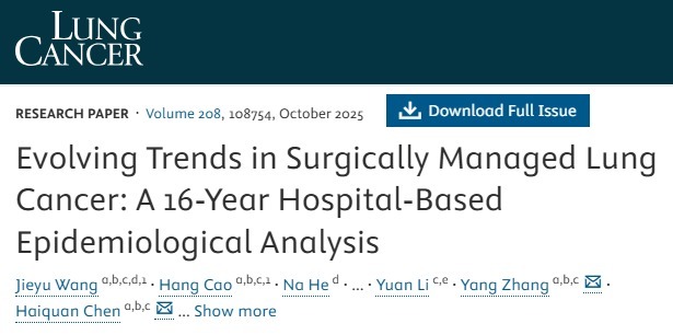 [5] Wang J, Cao H, He N, Liu X, Fu F, Deng C, Li Y, Zhang Y, Chen H. Evolving Trends in Surgically Managed Lung Cancer: A 16-Year Hospital-Based Epidemiological Analysis. Lung Cancer. 2025 Oct;208:108754. doi: 10.1016/j.lungcan.2025.108754. Epub 2025 Sep 16. PMID: 40986991.